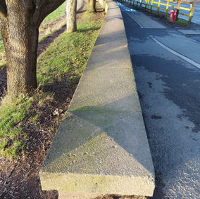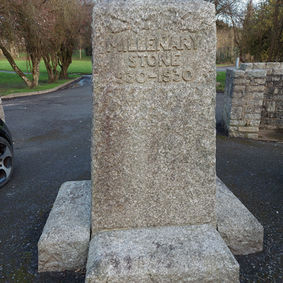 6. Follow footpath towards football field, past the bowling green. Cross the road carefully and on the left, stand at the Millenary stone 930-1930. Walk on a bearing of 20 degrees or turn to your left if you are facing the stone and walk until you hit the wall. Search here.