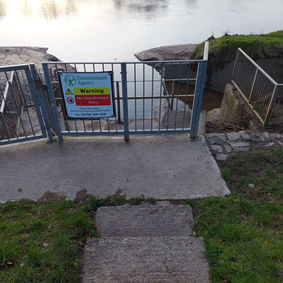 9. Go down the steps (no entry over the bridge) Half way down on the left look at the bottom of a fence post.