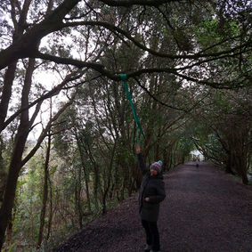 8. Go back to the footpath and walk towards Park school along the football fields, go past Eastside Football club hut and go up the steps on the right to the old railway line. Walk along the old railway line until you see the green sling hanging from a tree on the left. Look down the slope at the tree on the left and you will find number 8.