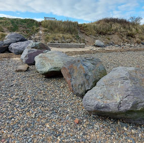 13. Nearly there - Just before you scramble up the path to the bench and the car park, have a look between the large grey rock groins on the beach for the final pebble.