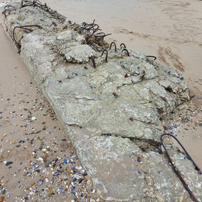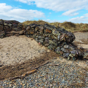 6.Keep walking along the beach towards the lighthouse and you will see a long, eroded piece of pebbly concrete with lots of rusty iron loops sticking out. Have a look around for number 6.