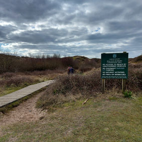 1. In the car park head towards the blue boat in the top right hand corner of the car park (the estuary will be on your left) Follow the track from the Broadstrand Acorn sign and go to the sign where you might get shot!