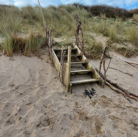 5.Now for a lovely stroll along the beach towards the lighthouse! When you get to the large grey boulders (about a 10 min walk towards Instow) you will see two wooden posts in the sand dunes. Check behind one of them to find the next pebble. But which one?