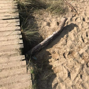 3.If you have your wellies on, enjoy a splash through the puddle, if not take the sandy path on the right and follow round to the left until you get back to the boardwalk. Count 5374 wooden slats (only joking) Follow the roller coaster boardwalk to the bottom of the hill until you find the log sticking out from the boardwalk. Here you will be very happy!